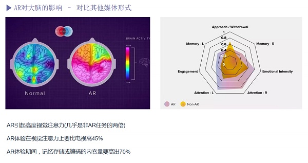 根據(jù)英國一家神經(jīng)學機構調(diào)研,AR內(nèi)容對比非AR內(nèi)容,通過嚴肅的AB測試,會發(fā)現(xiàn)它對于大腦的刺激更強,人會更容易接收到這種信息。正是人們更容易接受到這種信息,所以它更能夠幫助我們在一些創(chuàng)意中很好的傳遞這些信息。