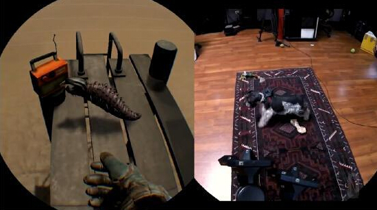 StressLevelZero的工作室里有一只名叫Bandit的狗狗,研發(fā)人員則為它制作了屬于自己的控制器——一根特殊的項(xiàng)圈。在它的作用下,Bandit得以進(jìn)入到虛擬世界當(dāng)中,成為了一個(gè)完全不同的虛擬角色。
