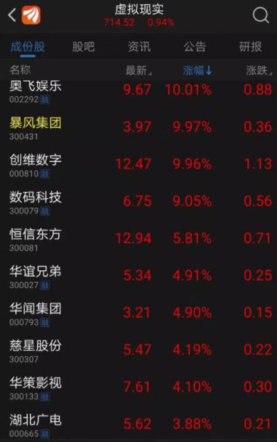 受利好消息刺激,在兩市震蕩走低的大背景下,多只虛擬現(xiàn)實(shí)概念股大漲。截至午間收盤,奧飛娛樂、創(chuàng)維數(shù)字等漲停。