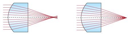 畸變用通俗的話來說就是圖像扭曲變形,給人以中間凸出(桶形畸變)或是凹陷(負(fù)畸變),這也屬于像差的一種,是由于入瞳(也就是人眼)處于光學(xué)系統(tǒng)中的前后位置不同造成的,對(duì)球面鏡片來說,該像差是不可避免的,如下圖左側(cè)圖所示,并且隨著FOV的增大,邊緣圖像畸變會(huì)更加明顯。為了解決該問題,目前常見的方法是采用非球面的設(shè)計(jì),如下圖右所示,它可以大大降低圖像的畸變,而且還能大大減輕鏡的重量,這也是目前高度數(shù)眼鏡片不再如瓶底那么厚的原因。