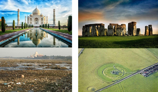 依稀記得,去年源自Arquitetura Sustent vel 網(wǎng)站的照片刷屏朋友圈,一條《世界著名景點(diǎn)原來是這樣(再也不相信照片了)》的帖子,帶大家領(lǐng)略了世界著名景點(diǎn)的另一面。頓時,那些原本驚艷得無與倫比的美景,瞬間讓人大跌了眼鏡:純白色大理石建筑,用玻璃、瑪瑙鑲嵌的泰姬陵如幻境般,實(shí)則不遠(yuǎn)處卻是垃圾泥濘地;4300多年前的英國巨型建筑——巨石陣,頗具人類未解之謎的神秘光環(huán),實(shí)則只是迷你的彈丸之地……讓人除了感嘆攝影師的技術(shù)了得之外,估計也只是剩下了無限意外。