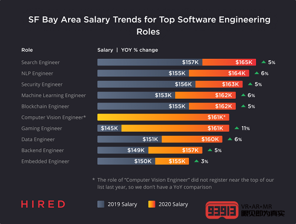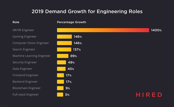 Hired的報(bào)告重點(diǎn)關(guān)注VR/AR工程師,最引人注目的數(shù)字是需求增長(zhǎng)猛增1400%,遠(yuǎn)超過(guò)其他任何工程角色。Hired發(fā)現(xiàn)46%的人將VR/AR列為他們想在2020年學(xué)習(xí)的三大技術(shù)之一,而74%的人則期望在未來(lái)五年內(nèi)看到AR和VR的所帶來(lái)影響。