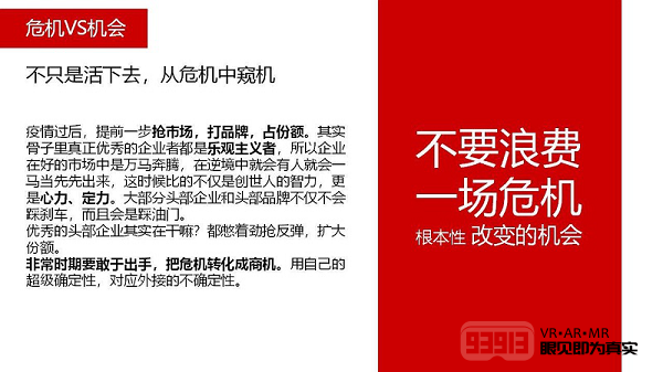 平心而論,在疫情期間看到XR行業(yè)企業(yè)及從業(yè)者組織此類互助性活動(dòng),我深感欣慰。我相信,在疫情來(lái)臨之際,我們能做的除了等待,還應(yīng)該有更多事情可做,在難得空閑的時(shí)間里復(fù)盤(pán)與思考,在盡可能的條件下抱團(tuán)取暖,這樣在疫情結(jié)束之后我們才會(huì)有更多機(jī)會(huì)發(fā)展自身業(yè)務(wù),推動(dòng)行業(yè)進(jìn)步。這里我想引用何總在此次活動(dòng)中的一句話:我們不只是要活下去,更要從危機(jī)中窺機(jī)。最后祝愿所有的XR行業(yè)企業(yè)都能在此次疫情中把握機(jī)遇,并在此次疫情后加速成長(zhǎng)。