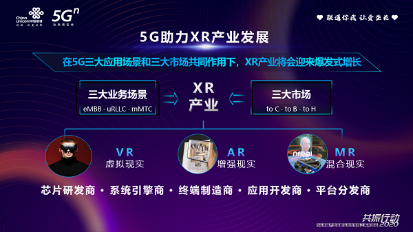 中國聯(lián)通終端與渠道支撐中心總經(jīng)理王啟明表示:2020年突如其來的疫情讓XR產(chǎn)業(yè)有了新的增長點,家庭娛樂的需求明顯、XR應(yīng)用場景廣闊、XR行業(yè)發(fā)展空間巨大、線上直播將成為主流趨勢。從2019年5G元年到2020年4G向5G切換過渡的重要時間節(jié)點,中國聯(lián)通將在5G三大應(yīng)用場景(eMBB、uRLLC、mMTC)和三大市場(to C/to B/to H)共同作用下,推動XR產(chǎn)業(yè)迎來爆發(fā)式增長。更多的殺手級應(yīng)用將出現(xiàn)在教育、游戲、交通、新電商、養(yǎng)老等諸多方面?;?G大環(huán)境,中國聯(lián)通將推出“1個聯(lián)盟、2個平臺、N個計劃”的XR全案策略,創(chuàng)建XR生態(tài)聯(lián)盟,搭建XR終端應(yīng)用商城開啟聯(lián)合落地計劃。