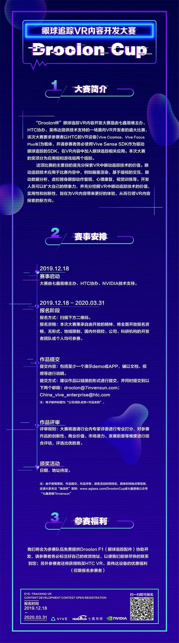 “Droolon杯”眼球追蹤VR內(nèi)容開(kāi)發(fā)大賽是由七鑫易維主辦、HTC協(xié)辦、英偉達(dá)提供技術(shù)支持的一場(chǎng)面向VR開(kāi)發(fā)者的盛大比賽,該次大賽要求參賽者以HTC的VR設(shè)備(Vive Cosmos、Vive Focus Plus等)為載體,Vive Sense SDK作為開(kāi)發(fā)內(nèi)容的SDK,在VR內(nèi)容中加入眼球追蹤相關(guān)應(yīng)用。本次大賽的獎(jiǎng)項(xiàng)分為應(yīng)用組和游戲組兩個(gè)組別。