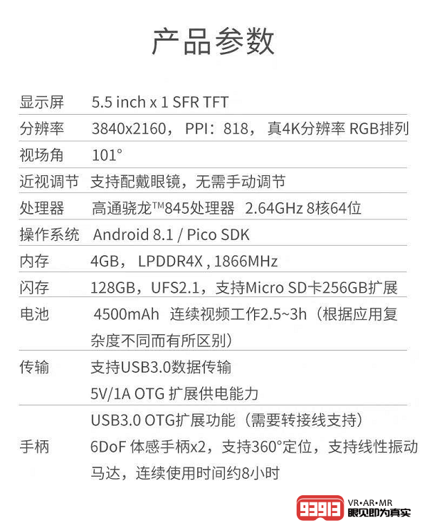 Pico Neo 2硬件配置也進(jìn)行了全面升級,搭載高通驍龍845處理器,相較上一代產(chǎn)品,性能提升30%,功耗降低20%;采用真4K快速響應(yīng)LCD屏幕,視場角可達(dá)101°,畫質(zhì)更加清晰、細(xì)膩、真實; 采用4500mAh后置電池和旋轉(zhuǎn)式綁帶設(shè)計,滿足長時間游戲時的佩戴需求。