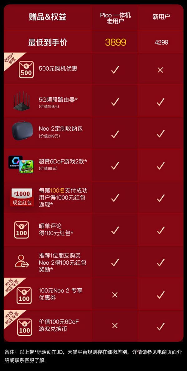 據(jù)了解,Pico Neo 2 新品上市定價為4399元,3月16日至24日為預(yù)定期,可享1分錢搶100元優(yōu)惠券+1000P幣(價值100元,可在Pico應(yīng)用商店購買游戲應(yīng)用)活動;3月25日至27日,新品進(jìn)行現(xiàn)貨開售,屆時新用戶活動最低到手價為4299元,一體機老用戶專享到手價為3899元,每日前100名購買的用戶可贏取價值千元的游戲禮包和贈品權(quán)益。上述活動在京東天貓平臺進(jìn)行,具體細(xì)節(jié)可參考對應(yīng)電商活動介紹。
