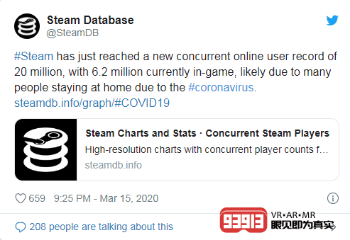 Steam數(shù)據(jù)庫公布了這項新記錄,并認為造成同時在線用戶如此之多的原因“可能是由于新型冠狀病毒而導致許多用戶呆在家里”。據(jù)報道,在2000萬在線用戶之中有620萬人正在進行游戲。這個數(shù)字也打破了將近20萬人的現(xiàn)有記錄。