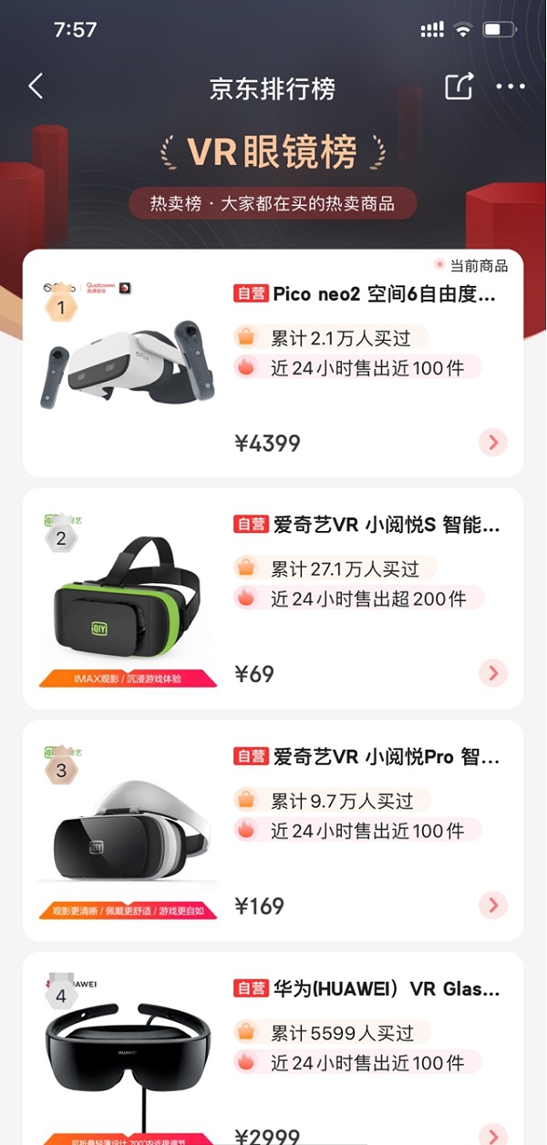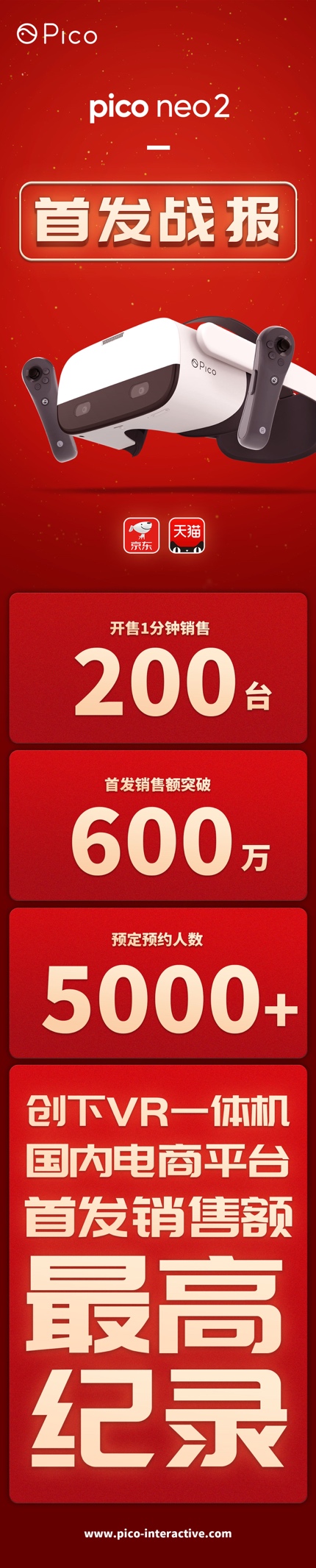 據(jù)官方發(fā)布戰(zhàn)報(bào)顯示,Pico Neo 2 雙平臺(tái)總預(yù)約預(yù)訂數(shù)超過(guò)5000人次,開售一分鐘即售出200臺(tái),消費(fèi)者對(duì)Pico熱情可見(jiàn)一斑。截至3月27日24點(diǎn)整,總銷售額突破600萬(wàn),創(chuàng)下了國(guó)內(nèi)VR一體機(jī)電商平臺(tái)首發(fā)銷售額最高記錄。從京東排行榜來(lái)看,在開售后的Pico Neo 2 僅用3天就登上了VR眼鏡熱賣榜Top 1,作為一款售價(jià)逾4000元的高單價(jià)旗艦產(chǎn)品,可以取得這樣的成績(jī)著實(shí)亮眼,也說(shuō)明Pico品牌實(shí)力確實(shí)得到了用戶的認(rèn)可。