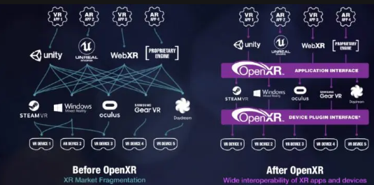 OpenXR是一個(gè)有關(guān)VR/AR技術(shù)的開(kāi)放標(biāo)準(zhǔn),它是由非營(yíng)利性行業(yè)聯(lián)盟Khronos旗下的一個(gè)工作組提出。該工作組包括了Facebook、Valve、微軟、英偉達(dá)、AMD、HTC、Google、Unity和Epic等VR行業(yè)的主流公司。