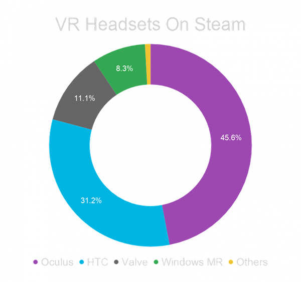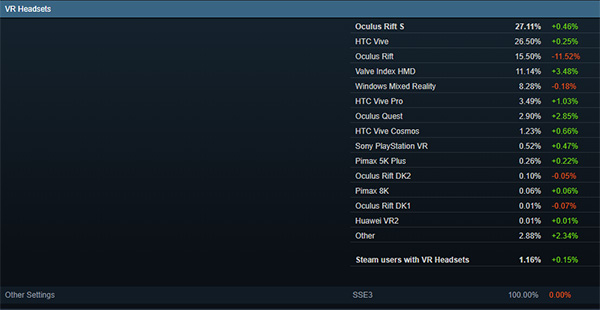 同樣根據(jù)Steam硬件和軟件調(diào)查報(bào)告,有將近一半(45.6%)來自Facebook旗下的Oculus,最受歡迎的是采用Inside-Out定位的Rift S,占比達(dá)27.11%;HTC Vive排在第二位,占比為31.2%,其中絕大部分來自于2016年推出的初代Vive,而被寄予厚望的最新消費(fèi)級(jí)設(shè)備Vive Cosmos似乎還未能贏得用戶青睞,占比只有1.23%,這甚至還不到Oculus Quest(2.9%)的一半。