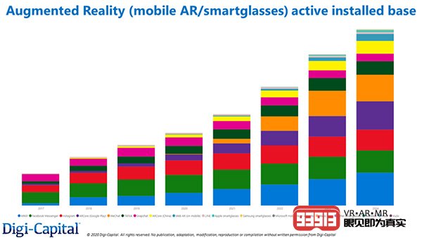 這樣一來,所有移動AR平臺加起來的活躍裝機(jī)量可能會從2019年的不足9億,增長到5年后的25億以上(注:活躍裝機(jī)量類型的總數(shù)據(jù)本身就涉及到重復(fù)計(jì)算,夸大了活躍在多個平臺上的用戶的總數(shù)。但是,這可以直接比較不同的平臺類型和平臺)。