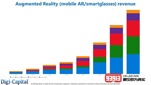 盡管COVID-19帶來了中短期的負(fù)面影響,到2024年,預(yù)計(jì) AR市場將超過25億活躍裝機(jī)量和近600億美元的收入。作為對比,2019年的活躍裝機(jī)量接近9億,收入超過80億美元。