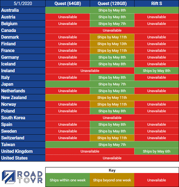 RoadtoVR整理的最新數(shù)據(jù)顯示,未來(lái)一周左右的時(shí)間內(nèi),澳大利亞、比利時(shí)、德國(guó)、冰島、意大利、新西蘭等國(guó)家和地區(qū)的新Quest(128GB版本)訂單預(yù)計(jì)將陸續(xù)發(fā)貨。64GB版本Quest、Rift S在絕大部分發(fā)售國(guó)家和地區(qū)依然處于長(zhǎng)期缺貨狀態(tài)。