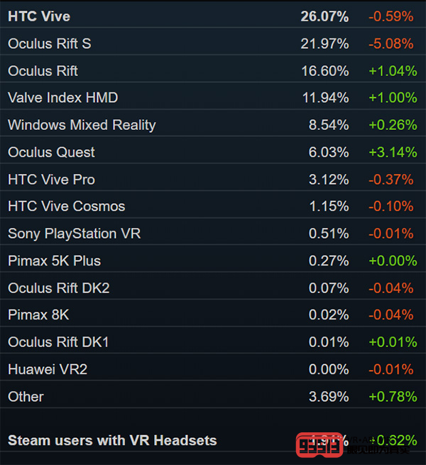 其他陣營(yíng)方面,F(xiàn)acebook旗下的Oculus份額雖小幅下跌,但依然幾乎占據(jù)半壁江山,達(dá)到44.68%,HTC以30.34%的份額緊隨其后,Windows MR在小幅上漲之后,以8.54%的份額排在Valve Index VR套件后面。