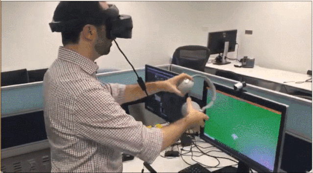 對于遠程工作者來說,他的手臂及手勢動作會被VR設(shè)備控制器記錄,從而呈現(xiàn)在“化身”身上。