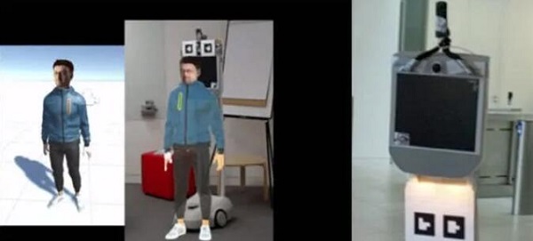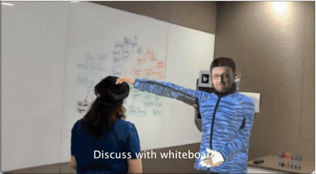 當(dāng)然,辦公室同事需要帶上AR頭顯設(shè)備。遠程工作者“化身”身邊的機器人的輔助,遠程工作者和辦公室在場工作者可以“在一個時空匯聚”,看到彼此并打招呼。