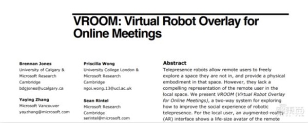 VROOM由西蒙·弗雷澤大學(xué)與微軟研究院的研究人員共同研發(fā),他們在論文中說:“為了讓虛擬機器人和VROOM的配合呈現(xiàn)更直觀,我們用了屏幕。但是其實在使用時,不需要屏幕,只需要帶著VR頭顯就可以了。未來,這一技術(shù)可能繼續(xù)迭代,能夠使用任何可驅(qū)動的帶有360°攝像功能的機器人。”