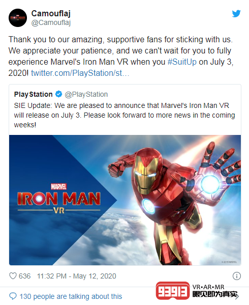 《鋼鐵俠VR》開發(fā)商、美國游戲廠商Camouflaj也在同期轉(zhuǎn)發(fā)了索尼互動(dòng)娛樂這條官方推特,并表示感謝長期以來一直在背后默默支持的粉絲,同時(shí)期待與粉絲們?cè)?月3日相聚于游戲之中。