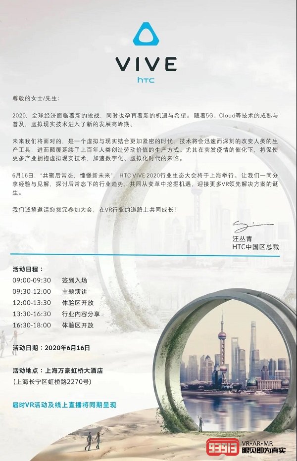 6月16日,HTC VIVE將在上海舉辦HTC VIVE 2020行業(yè)生態(tài)大會,為您呈現(xiàn)行業(yè)領(lǐng)域的前沿信息,帶來全新的商業(yè)機遇,助力企業(yè)正常業(yè)務(wù)的重啟,以待后疫情時代更強有力的爆發(fā)。