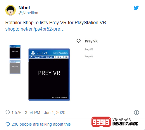 據(jù)海外游戲新聞媒體IGN報道,近日英國在線商城ShopTo泄露了由游戲大廠Bethesda(B社)發(fā)行的FPS游戲《掠食(Prey)》的VR版本《掠食 VR》。盡管該游戲商品頁面很快被刪除,但推特用戶Nibellion在游戲下架之前截取了《掠食 VR》的商品封面截圖,根據(jù)截圖顯示,該游戲為PSVR平臺獨占。