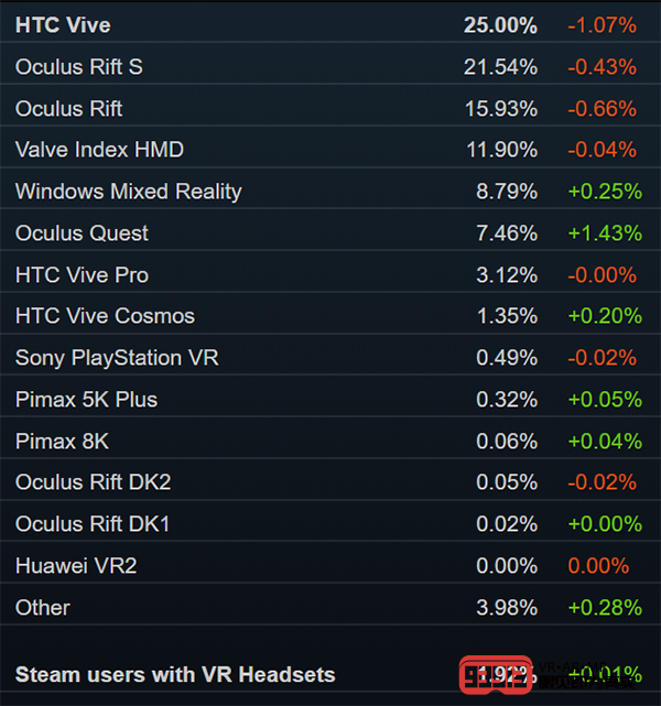 5月Steam硬件和軟件調(diào)查報告顯示,Valve Index的份額不僅沒有繼續(xù)保持上漲之勢,反而下跌0.04%,最新份額為11.90%。不過,由于身前的Vive、Rift S和Rift跌幅相對更大,份額差距進一步縮小了。