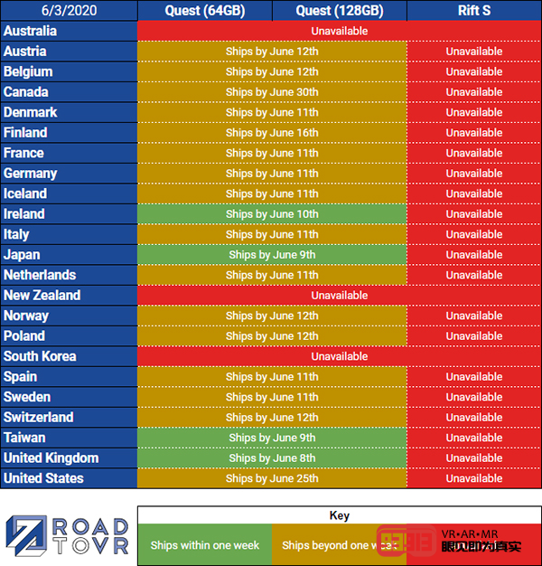 同樣受疫情的影響,F(xiàn)acebook的供貨能力卻明顯比Valve強不少。截至6月3日,Quest均已得到較為充足的庫存補充,除澳大利亞、新西蘭以及韓國處于缺貨狀態(tài),加拿大和美國發(fā)貨周期較長之外,其他國家和地區(qū)基本都恢復(fù)相對正常的供貨。