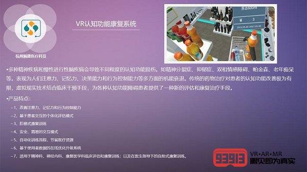 認(rèn)知功能康復(fù)軟件是結(jié)合臨床干預(yù)技術(shù),基于虛擬現(xiàn)實(shí)平臺(tái)開發(fā)的臨床應(yīng)用解決方案。該產(chǎn)品主要應(yīng)用于,各種腦功能疾病所致認(rèn)知功能損害的康復(fù)訓(xùn)練,如退行性腦疾病、精神疾病及腦損傷所致的注意力、記憶力、執(zhí)行控制能力障礙等。