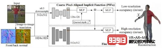 基于當今的硬件水平,像PIFu這樣的系統(tǒng)只能處理相對低分辨率的輸入圖像,這嚴重影響了輸出模型的準確性和細節(jié)展示。而PIFuHD則采用了一種全新的算法,對輸入圖像進行降采樣,并將其輸入到PIFu的低細節(jié)“course”基礎(chǔ)層,然后通過一個全新的獨立網(wǎng)絡(luò),使用全分辨率來展示超高清的細節(jié)內(nèi)容。