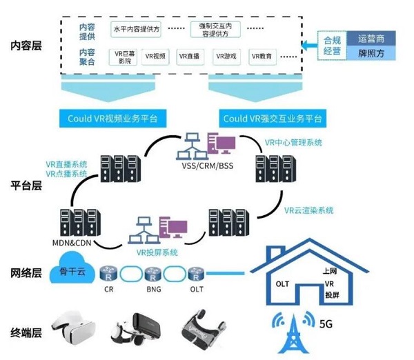 位于頂端的內(nèi)容層主要負(fù)責(zé)向平臺提供VR內(nèi)容,包含內(nèi)容提供方和內(nèi)容聚合方,VR的主要內(nèi)容包括Cloud VR的視頻業(yè)務(wù)及Cloud VR的強(qiáng)交互業(yè)務(wù)。