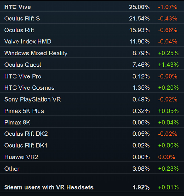 5月Steam硬件和軟件調查報告顯示,Valve Index以11.90%的份額居于Facebook(Oculus)和HTC Vive陣營之后,雖然整體份額上的差距依然很大,但從最近幾個月的數據趨勢來看,差距在一點點縮小。
