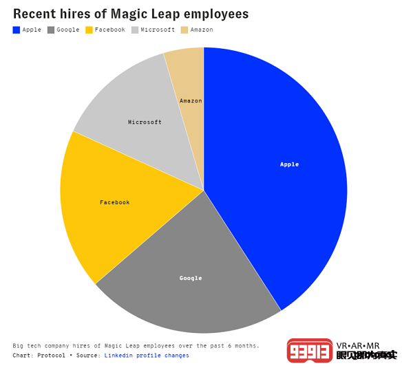 根據(jù)科技媒體protocol公開的一份調(diào)查報告顯示,Magic Leap被裁員工大多數(shù)進入了包括蘋果、Facebook、谷歌、微軟和亞馬遜在內(nèi)的硅谷各大科技公司。在過去的六個月中,蘋果聘用了最多名來自Magic Leap的前員工,并將這些員工定位為XR原型開發(fā)人員、計算機視覺工程師和光學(xué)系統(tǒng)工程師,蘋果確信隨著新員工的到來,將會對公司正在開發(fā)中的AR頭顯項目起到積極推進作用。
