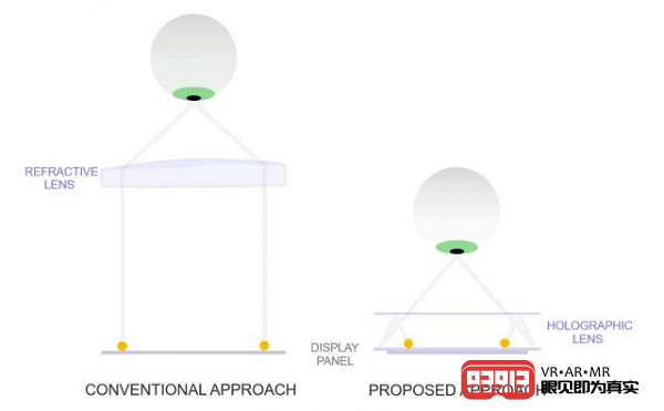 同時,為了使頭顯變得更薄(以縮小光學鏡頭本身的尺寸),F(xiàn)acebook研究人員還采用了全息光學技術來實現(xiàn)這一效果。