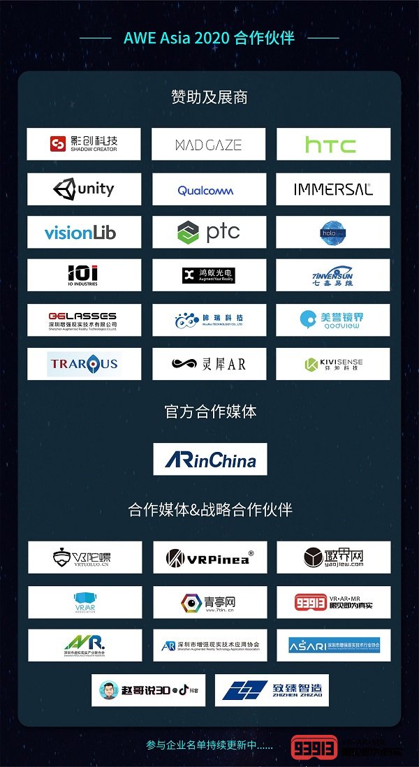 在歷屆AWE大會(huì)上,不僅有Lenovo、Joinpad、Vufine、華為等諸多國(guó)內(nèi)外頂尖企業(yè)贊助及參展,還有來自美國(guó)、德國(guó)、意大利、韓國(guó)、澳大利亞等國(guó)家的多位國(guó)際頂尖演講嘉賓進(jìn)行技術(shù)分享和產(chǎn)品演示。本屆AWE Asia 2020贊助及展商如下: