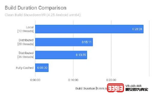 以VR游戲《ShowdownVR》為例進(jìn)行的測(cè)試結(jié)果顯示,通過(guò)FASTBuild系統(tǒng)分布式編譯36個(gè)線程僅需13分鐘39秒,而使用12個(gè)線程進(jìn)行本地編譯則需要28分鐘28秒。