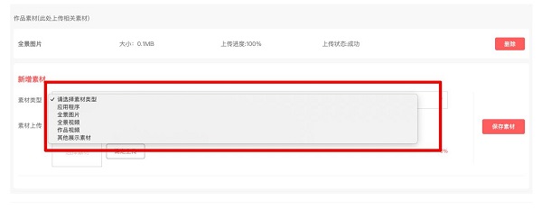 素材類型分為:應(yīng)用程序、全景圖片、全景視頻、作品視頻、其他展示素材