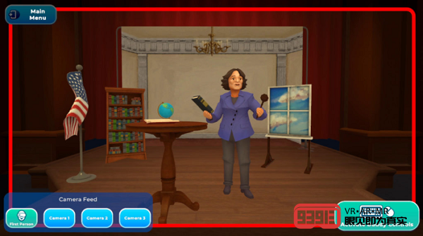 學(xué)生們可以在HistoryMaker VR上任意選擇一個(gè)歷史人物,同時(shí)為其設(shè)置演講臺(tái)背景和道具,只要導(dǎo)入演講腳本,就可以在VR環(huán)境中聆聽這名歷史人物的演講。此外,該應(yīng)用還提供了綠幕選項(xiàng),學(xué)生們可以充分運(yùn)用該功能創(chuàng)建個(gè)性化的演講臺(tái)背景。除了綠幕功能,HistoryMaker VR還提供了“鏡像模式”,學(xué)生們可以通過該模式看到身處VR環(huán)境中自己的行為,從而有針對(duì)性的進(jìn)行調(diào)整。