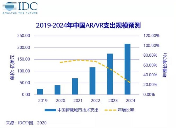 2020年過半,由于嚴(yán)格管制和企業(yè)復(fù)工推遲等因素影響,新冠肺炎疫情對(duì)全球各個(gè)行業(yè)的應(yīng)用場景都帶來了一些波動(dòng)。根據(jù)最新發(fā)布的《IDC全球增強(qiáng)與虛擬現(xiàn)實(shí)支出指南》(IDC Worldwide Augmented and Virtual Reality Spending Guide, 2020V1),至2020年,全球AR/VR(增強(qiáng)與虛擬現(xiàn)實(shí))市場相關(guān)支出規(guī)模將達(dá)到106.7億美元,較2019年同比增長35.3%,與上期預(yù)測(cè)的漲幅78.5%相比降低了約一半。但I(xiàn)DC預(yù)計(jì),預(yù)測(cè)期內(nèi)(2020-2024年)5年CAGR(復(fù)合年均增長率)仍將達(dá)到76.9%,這表明疫情對(duì)全球市場的抑制作用只是短期的。