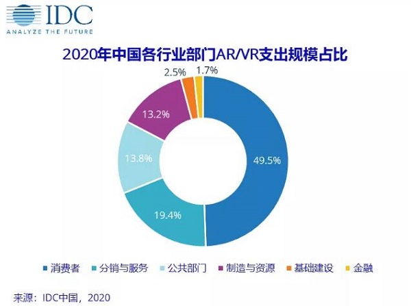 IDC將所有行業(yè)分為消費(fèi)者、商用和公共部門。IDC預(yù)計(jì),2020年中國AR/VR市場規(guī)模最大的依然是消費(fèi)者行業(yè),約占總支出的50%,但其增長速度較商用行業(yè)將放緩。中國商用領(lǐng)域的AR/VR相關(guān)投資將保持增長態(tài)勢(shì)。在預(yù)測(cè)期內(nèi)(2020-2024年),支出最高的商用行業(yè)依次為零售、流程制造、離散制造、建筑和個(gè)人及消費(fèi)者服務(wù)。而在疫情的影響下,公共部門行業(yè)得以加速信息化發(fā)展,推動(dòng)了醫(yī)療、教育、政府行業(yè)的技術(shù)落地。IDC預(yù)測(cè),2020年醫(yī)療供應(yīng)將成為增速最快的行業(yè),5年CAGR(復(fù)合年均增長率)為107.7%。