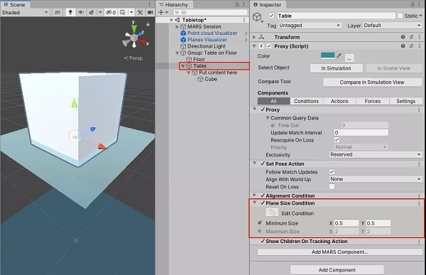 我們提供有一種“對象出現(xiàn)在桌面”的經(jīng)典示例,要制作此類場景有幾種不同的方法,可以使用Unity MARS的拖放操作工作流,也能使用MARS面板中的快捷創(chuàng)建代理對象。模板中所有條件數(shù)值已經(jīng)過調(diào)試,其中放置了一個簡單的立方體,用戶可以用自己的數(shù)字內(nèi)容來替換立方體。