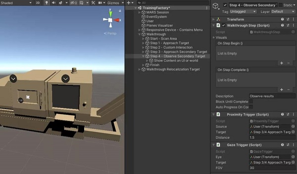 一個步驟可以有多個推動進程的觸發(fā)器。我們制作了最為常見的步驟合集,包括接近距離、代理對象狀態(tài)和目光。觸發(fā)器為單功能腳本,會告知步驟的推進時機。用在Unity MARS中后,就能制作出可對現(xiàn)實反應的步驟式體驗。