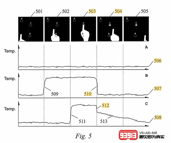 蘋(píng)果的想法是,可以通過(guò)紅外熱感應(yīng)來(lái)檢測(cè)用戶何時(shí)觸摸現(xiàn)實(shí)世界的物體,這個(gè)方法可以讓AR眼鏡在視覺(jué)上將控件投射到現(xiàn)實(shí)世界的物體上,并在用戶觸摸這些物體時(shí),通過(guò)感知觸摸物體時(shí)的熱傳導(dǎo)來(lái)做出反應(yīng)。