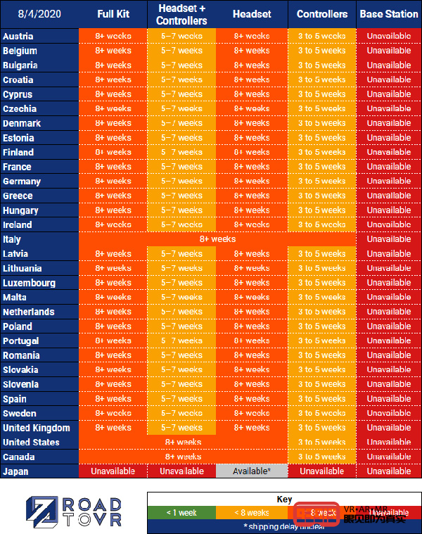 盡管Valve Index套件(Full Kit)的排名較上上周(7月27日-8月2日)的亞軍略有下滑,但此番攜手「V社VR頭顯+控制器」分別位居第四位和第六位,也可謂相當(dāng)搶眼,再再一次為VR贏得高光時(shí)刻。根據(jù)RoadtoVR的最新統(tǒng)計(jì)數(shù)據(jù),在絕大部分國(guó)家和地區(qū),Valve Index套件(Full Kit)和單獨(dú)頭顯(Headset)需要等待8周+才能發(fā)貨,「VR頭顯+控制器」的發(fā)貨周期則縮減到5-7周,這可能也是這個(gè)組合能排進(jìn)Steam周銷量榜前六的主要原因。