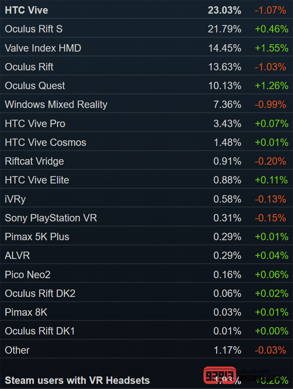 7月Steam硬件和軟件調(diào)查報(bào)告顯示,Valve Index的最新份額已經(jīng)達(dá)到歷史新高的14.45%,并正式超越Oculus Rift(13.63%),僅落后于HTC Vive(23.03%)和Oculus Rift S(21.79%)。