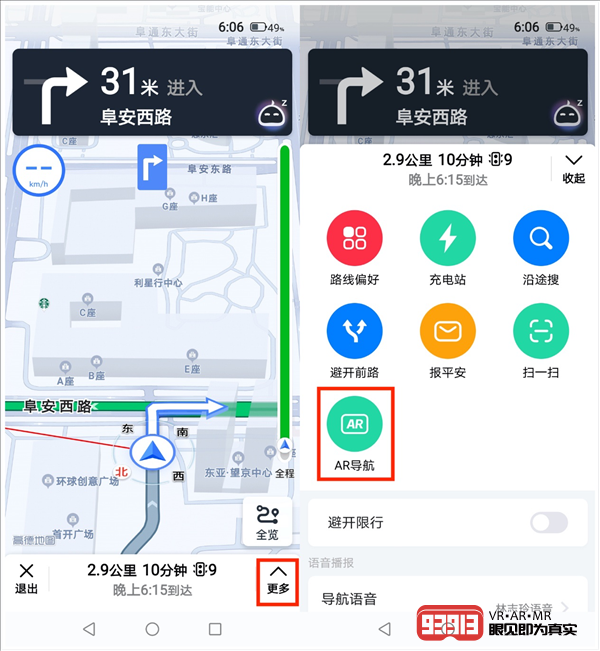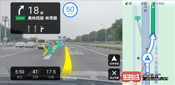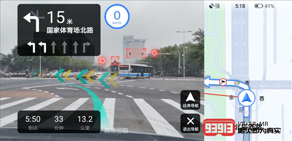 在使用時(shí),高德AR導(dǎo)航與傳統(tǒng)的地圖導(dǎo)航會(huì)同時(shí)在手機(jī)屏幕上分左右側(cè)呈現(xiàn),最大化地方便用戶查看和快速理解。如果用戶不想使用AR導(dǎo)航,也可一鍵切換至經(jīng)典導(dǎo)航模式。