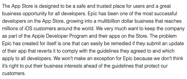 針對(duì)Epic Games的一系列指控,蘋(píng)果在隨后發(fā)表的一份聲明中表示,如果想解決問(wèn)題,那就遵守App Store指導(dǎo)方針提交應(yīng)用更新,并態(tài)度明確的堅(jiān)持“不會(huì)為Epic Games破例”—— 因?yàn)橐坏┻@個(gè)口子被打開(kāi),勢(shì)必會(huì)導(dǎo)致開(kāi)發(fā)者生態(tài)的連鎖反應(yīng)。