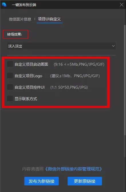 “項(xiàng)目UI自定義”模塊;自定義轉(zhuǎn)場(chǎng)效果:淡入淡出、縮放過渡等;自定義啟動(dòng)畫面;自定義Logo;自定義項(xiàng)目控件UI;自定義添加作者聯(lián)系方式;H5添加全屏顯示;H5添加"cardboard"顯示。