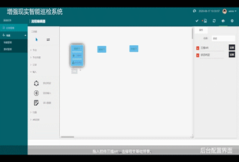 PSS全終端工作輔助系統(tǒng)主要分為操作客戶(hù)端和網(wǎng)頁(yè)管理端兩個(gè)部分。操作客戶(hù)端采用墨鏡式AR眼鏡以及小型PC,一線巡檢人員通過(guò)眼鏡進(jìn)行可視化AR交互與引導(dǎo)作業(yè),并實(shí)時(shí)采集數(shù)據(jù)進(jìn)行數(shù)據(jù)分析,協(xié)助進(jìn)行設(shè)備狀態(tài)智能化判斷;在遇到難以解決的問(wèn)題時(shí),可與技術(shù)專(zhuān)家進(jìn)行遠(yuǎn)程視頻通話,獲得操作指導(dǎo)。網(wǎng)頁(yè)管理端采用WEB部署的模式,可在任意設(shè)備上打開(kāi)網(wǎng)頁(yè)管理界面進(jìn)行操作,包含人員管理,任務(wù)編輯,素材管理,權(quán)限設(shè)定等功能,核心為巡檢任務(wù)的流程編輯,可根據(jù)實(shí)際的巡檢需求,靈活編輯定制巡檢任務(wù)流程,導(dǎo)入圖文聲像及3D模型動(dòng)畫(huà)等AR素材,并發(fā)布到客戶(hù)端進(jìn)行操作。