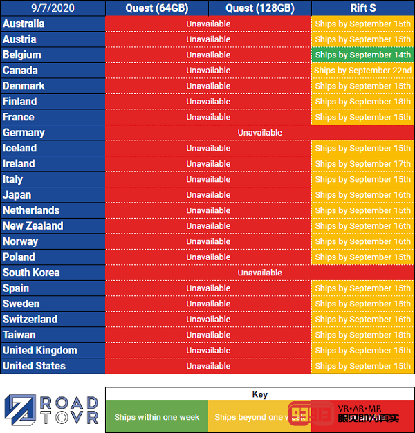 RoadtoVR在Oculus官網(wǎng)上查看了購(gòu)買Quest(64GB)、Quest(128GB)及Rift S頭顯所在地區(qū)的庫(kù)存量。根據(jù)最新的數(shù)據(jù)顯示,Quest(64GB)和Quest(128GB)的庫(kù)存已從大多數(shù)地區(qū)的穩(wěn)定供貨狀態(tài)轉(zhuǎn)變?yōu)槿蚍秶鷥?nèi)的缺貨狀態(tài)。而Rift S則不受影響,仍在全球大多數(shù)地區(qū)有售,其缺貨時(shí)間也僅在一周以上。