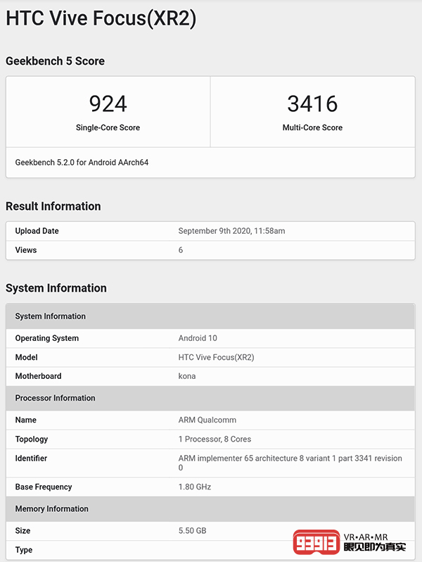 從Geekbench跑分信息來看,「HTC Vive Focus」搭載高通驍龍XR2芯片,基于Android 10系統(tǒng),配備6GB RAM。從單核924分/多核3416分的跑分表現(xiàn)來看,驍龍XR2的整體性能表現(xiàn)與驍龍865相當,較之XR1有不小的提升。